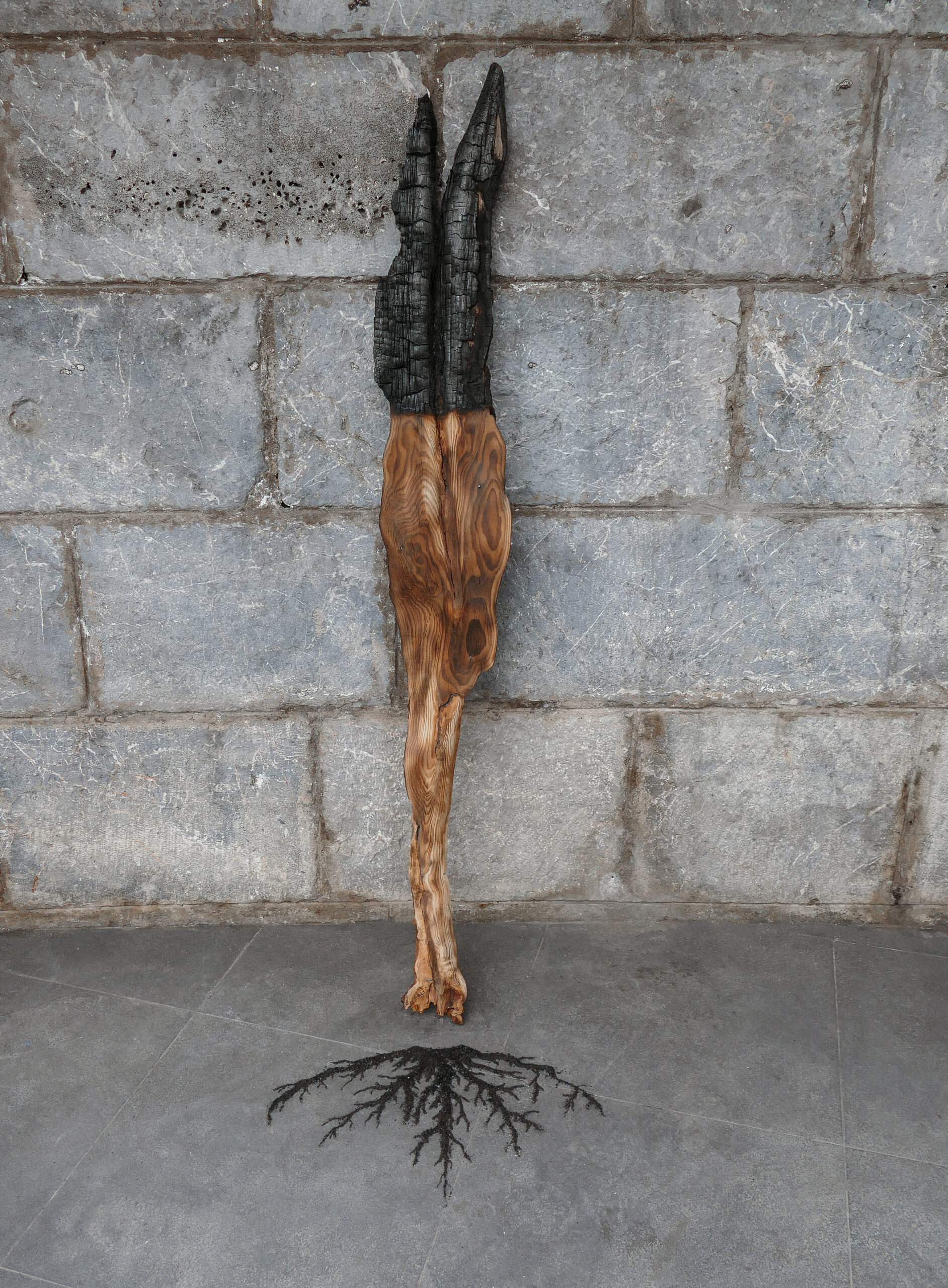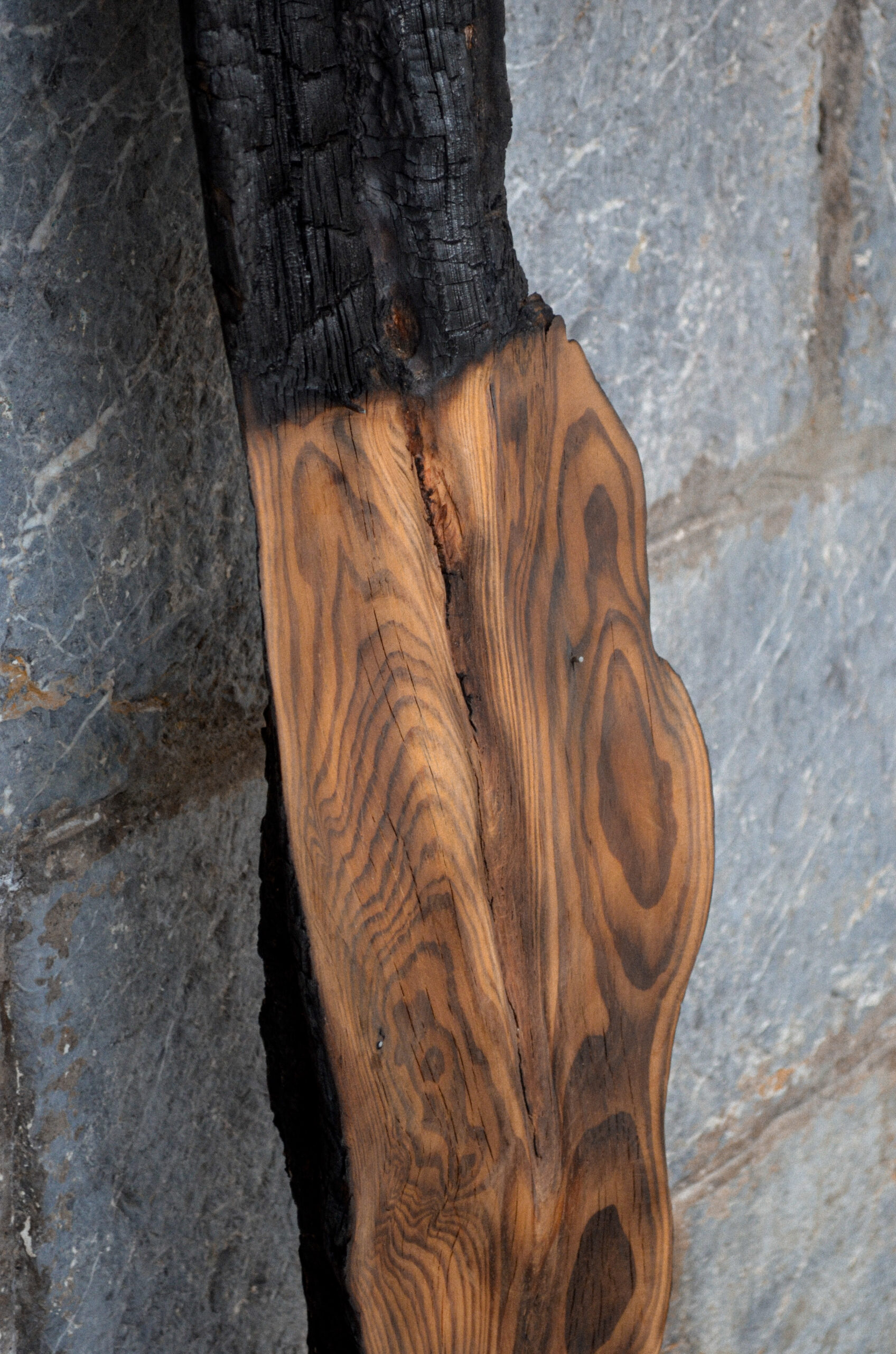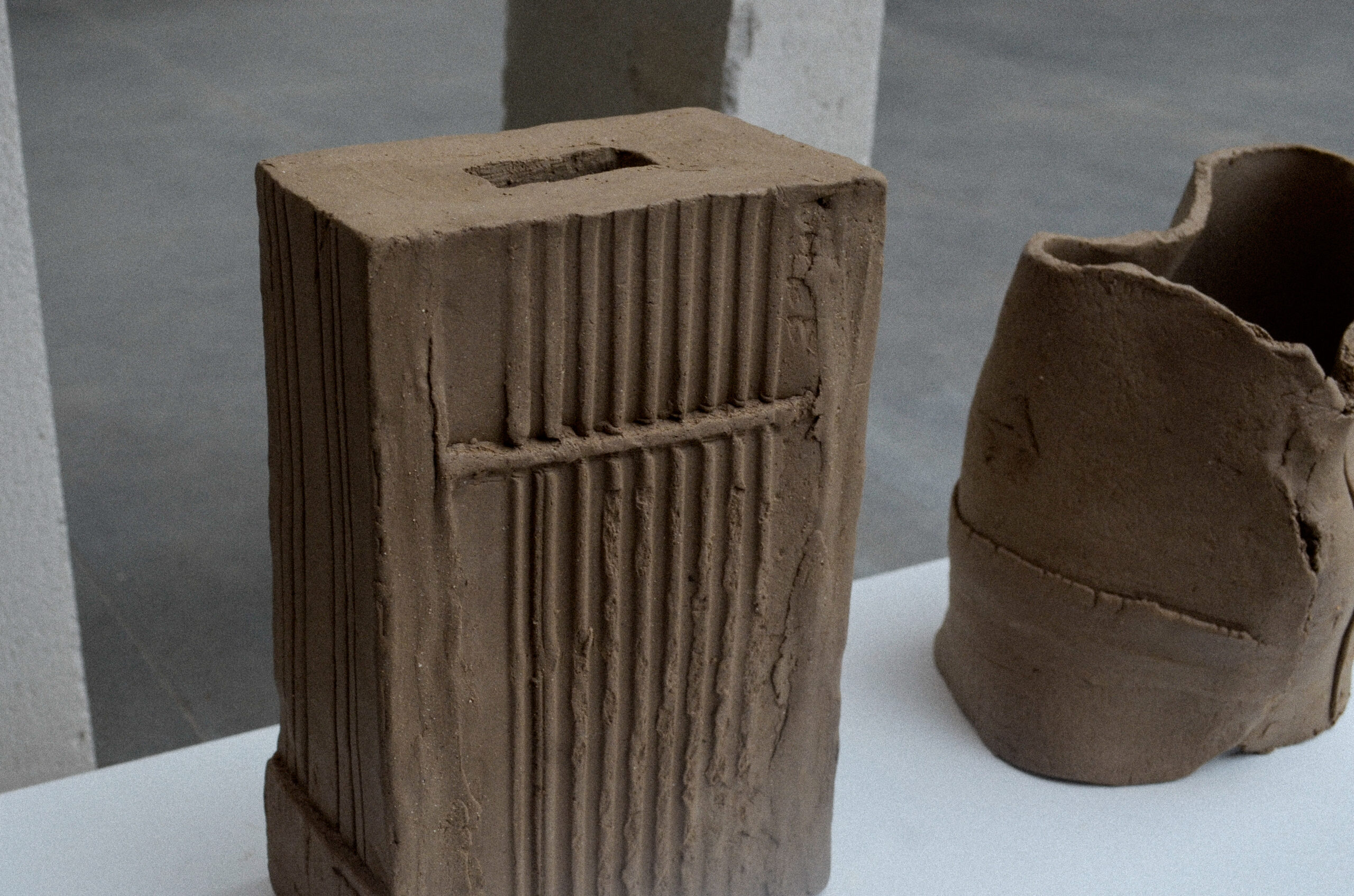 Burnt surfaces are slowly sanded away, re-written by time, care, and contact, their dust archived. Clay sediments are reshaped into objects that recall architectural fragments: thresholds, sills, remnants of disrupted domesticity. Decay is not resisted but embraced, the sculptures remain unfinished, exposed to touch, time, and weather.