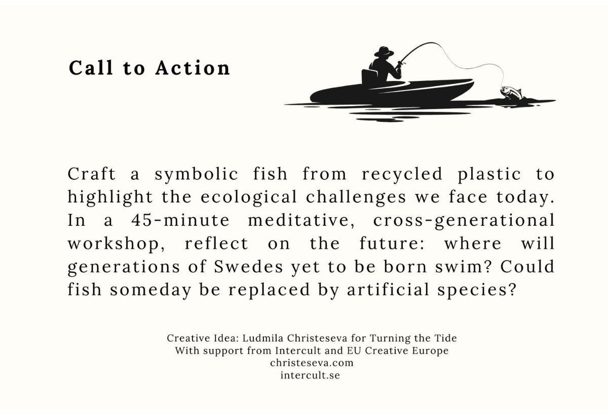 Ludmila Christeseva proposes several creative activities and toolkits on how to engage friends and colleagues into meaningful conversations about water conservation and sustainability while fostering teamwork and creativity. She starts with creating a symbolic fish soup using recycled materials like plastic as an artistic representation of how pollution is affecting marine life and water systems. The act of making the soup challenges participants and viewers to reflect on the future of water bodies, sustainability, and the lasting impacts of pollution. Additionally, Ludmila incorporates recycled materials into crafting dynamic installations that symbolize future fish, encouraging participants to think creatively about waste and its transformation into art. These hands-on interventions are accompanied by thought-provoking questions to foster deeper understanding and inspire collective action.