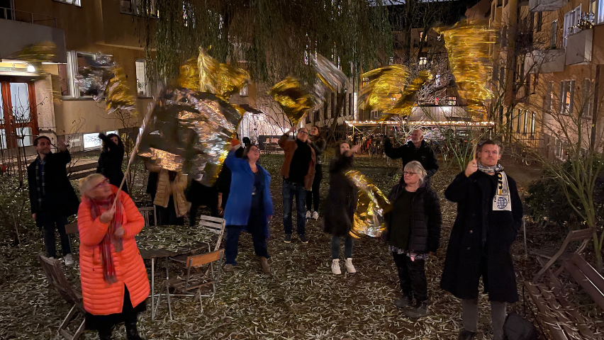 Robitaille’s presentation culminated in an outdoor performance at Intercult’s yard, where participants, carrying golden flags, staged a symbolic protest for hope. This collective action represented resilience and optimism in the face of environmental challenges. The event concluded with a communal message placed in the Bucket of Hope, symbolizing the shared commitment to building a sustainable future.