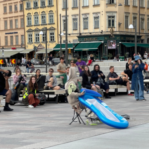 Audience members were invited to contemplate a dystopian scenario where we might one day need to adapt—perhaps even grow gills—as a result of rising sea levels and increasing pollution. The performance, described as a “refreshing breeze with warm, wet regards from Lake Mälaren and the future,” offered a mix of satire and serious reflection on the pressing issue of climate change.