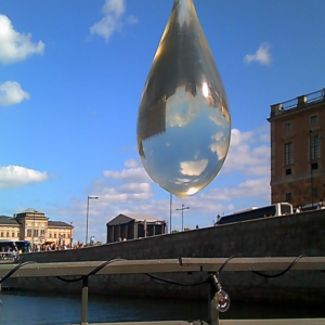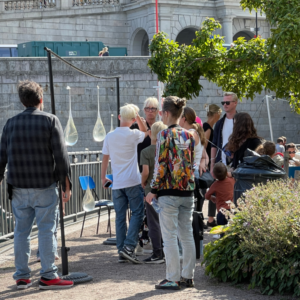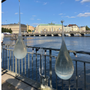 At Norrbro/Strömparterren, Tina Eskilsson’s Vikten av vatten invited festival visitors to reflect—quite literally—on the significance of water in their lives. Tina Eskilsson, known for her interdisciplinary work with water, created an installation of large water drops suspended on strings. Visitors peered through the drops and saw an upside-down reflection of the surrounding environment, a visual metaphor for how climate change could turn our world upside down.